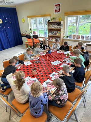 W dniu 18.09.2025 r. biblioteka w Radwankach gościła dzieci z Przedszkola w Radwankach z grupy "Pszczółki Mai". Wizyta odbyła się z okazji Międzynarodowego Dnia Kropki. Podczas spotkania dzieci wysłuchały opowiadania pt. "Biedronka Fionka" autorstwa Benedicte Carboneill. Po lekturze odbyła się rozmowa na temat kropek - gdzie je można znaleźć i kto je ma. Dzieci z entuzjazmem wskazywały różne przykłady, nie zapominając o sobie samych, ponieważ każde z nich miało na sobie element stroju w kropki.