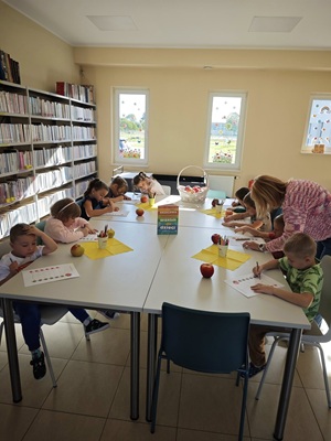 W dniu 26.09.2025 r. bibliotekę w Lipinach odwiedziły przedszkolaki z grupy Myszki Miki z Przedszkola Samorządowego w Margoninie, aby wspólnie odchodzić Dzień Jabłka. Dzieci dowiedziały się, dlaczego warto jeść jabłka i jak wiele odmian tych owoców możemy spotkać. Podczas spotkania nie zabrakło literackich i muzycznych akcentów. Wiersz Jana Brzechwy „Entliczek-pentliczek” wprowadził przedszkolaki w świat zabawy słowem, a piosenka o jabłuszku porwała najmłodszych do wspólnego tańca i śpiewu. Dużą atrakcją okazało się własnoręczne przygotowanie świeżego, pachnącego soku jabłkowego, który wszystkim bardzo smakował.