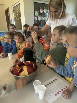 Najwięcej radości sprawiła część kulinarna. Na zakończenie spotkania wspólnie przygotowano pyszny i zdrowy sok jabłkowy, który zniknął w mgnieniu oka. Każdy mógł także sięgnąć po świeże jabłko – smaczną i wartościową przekąskę, która idealnie wpisała się w charakter dnia.