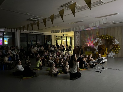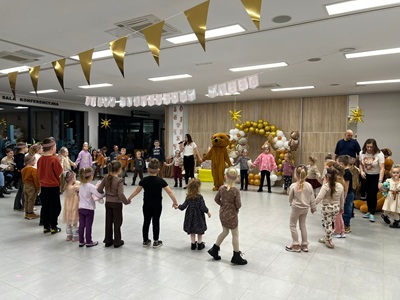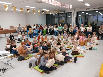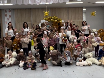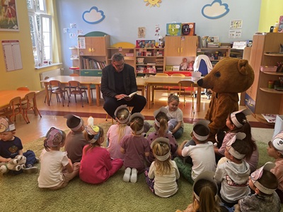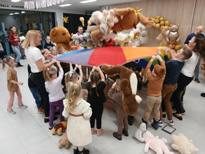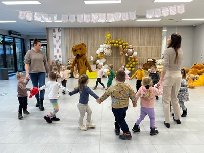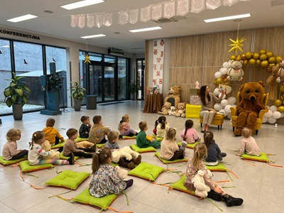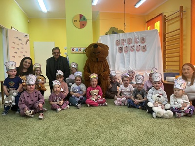 Na początku spotkania pojawił się wyjątkowy gość - Miś. Dzieci powitały go piosenką, a on opowiedział im, dlaczego postanowił ich odwiedzić oraz jak bardzo cieszy się ze wspólnego spotkania. Przedszkolaki mogły także przytulić Misia, po czym wszyscy razem wykonali pamiątkowe zdjęcie.