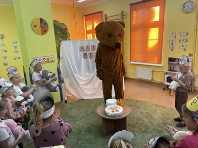 Nie zabrakło również ruchu i muzyki. Dzieci zatańczyły do piosenki „Stary Miś nie chce spać”, a na koniec głośno i radośnie zaśpiewały Misiowi „Sto lat!”. Była to wspaniała, pełna radości i kreatywnej zabawy wizyta.