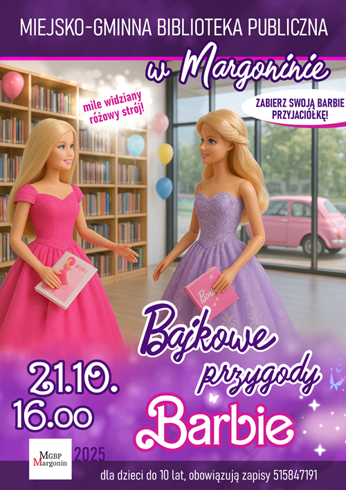 W dniu 21.10.2025 r. o godz. 16.00 zapraszamy dzieci w wieku do 10 lat na spotkanie "Bajkowe przygody Barbie". Zachęcamy do zabrania swojej Barbie - przyjaciółki. Mile widziany różowy strój. Obowiązują zapisy.
