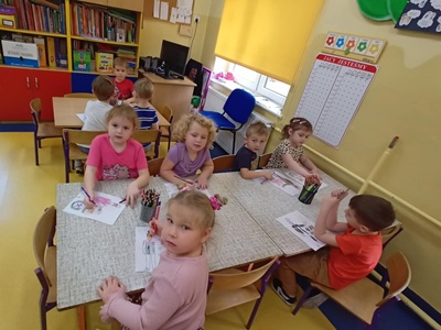 Następnego dnia bibliotekarka odwiedziła przedszkole. Rozmawialiśmy o wizycie górnika, przeczytaliśmy książkę pt. "Górnik - poznajemy różne zawody". Na zakończenie każdy przedszkolak pokolorował obrazek przedstawiający górnika.