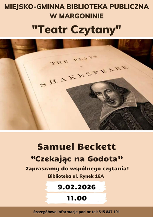 W dniu 09.02.2026 r. o godz. 11.00 zapraszamy na spotkanie grupy "Teatru Czytanego", podczas którego czytać będziemy utwór Samuela Becketta pt. "Czekając na Godota".