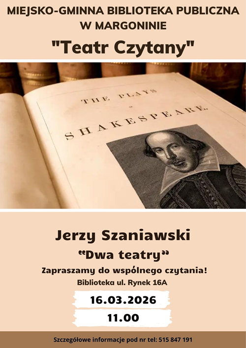 W dniu 16.03.2026 r. o godz. 11.00 zapraszamy na spotkanie grupy "Teatru Czytanego", podczas którego kontynuować będziemy czytanie dramatu Jerzego Szaniawskiego pt. "Dwa teatry".